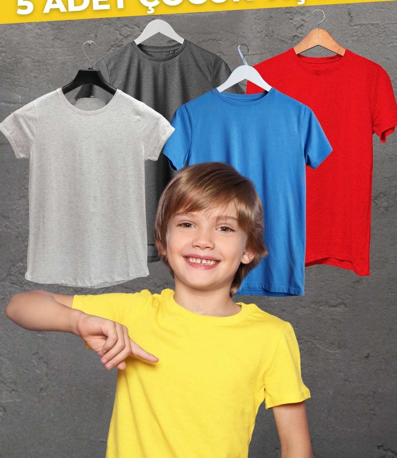 5 Adet Bisiklet Yaka Çocuk Tişört Sarı,Kırmızı,Mavi,Gri,Antrasit