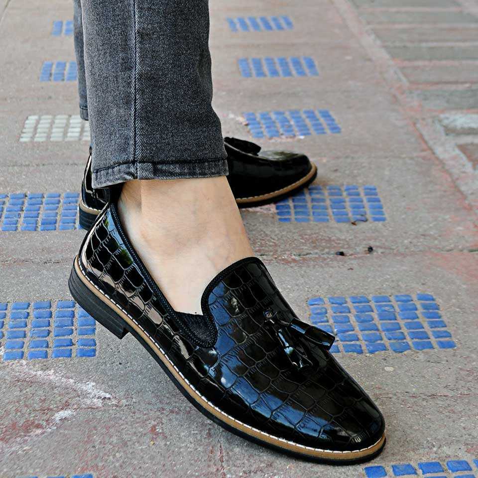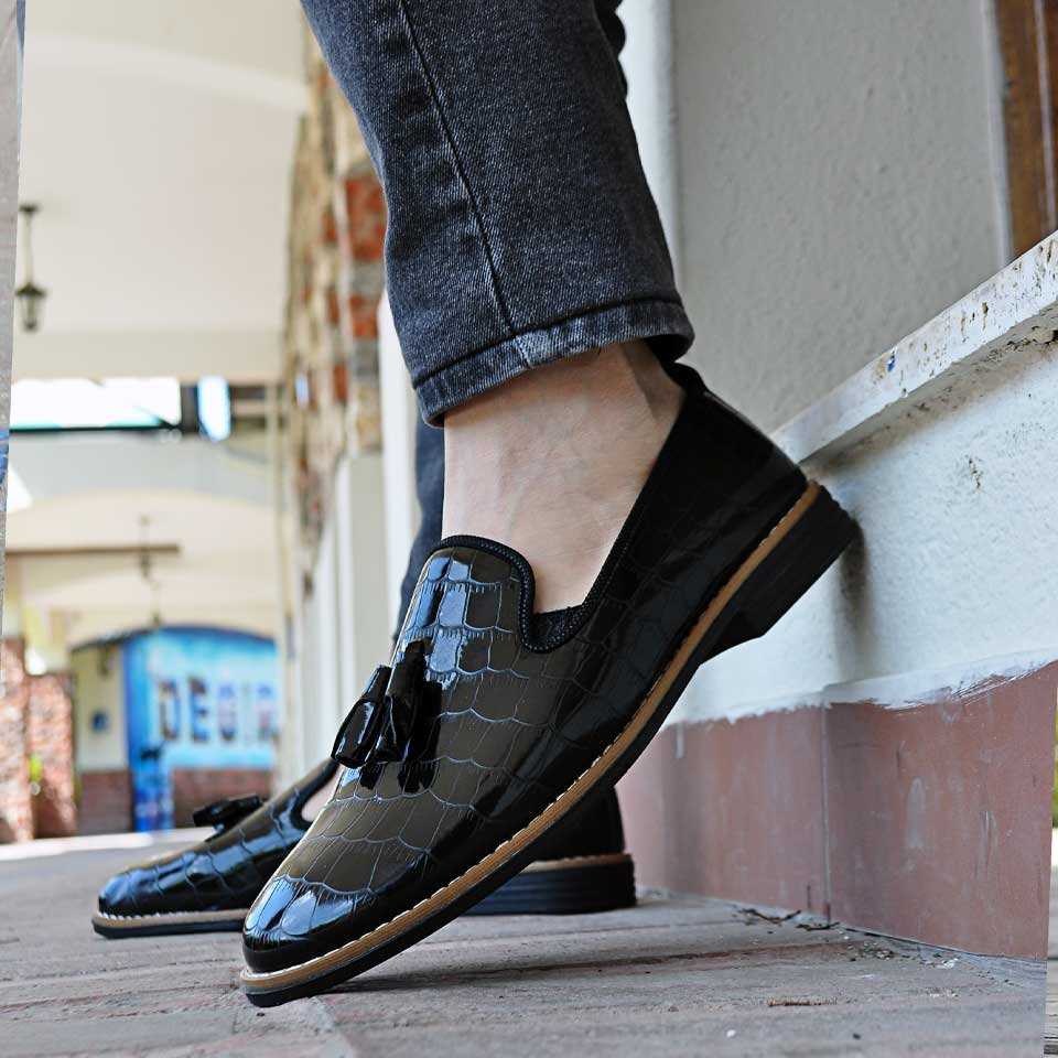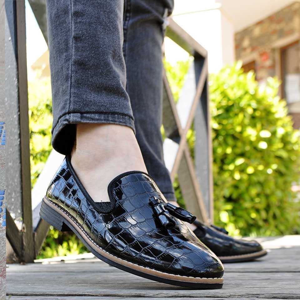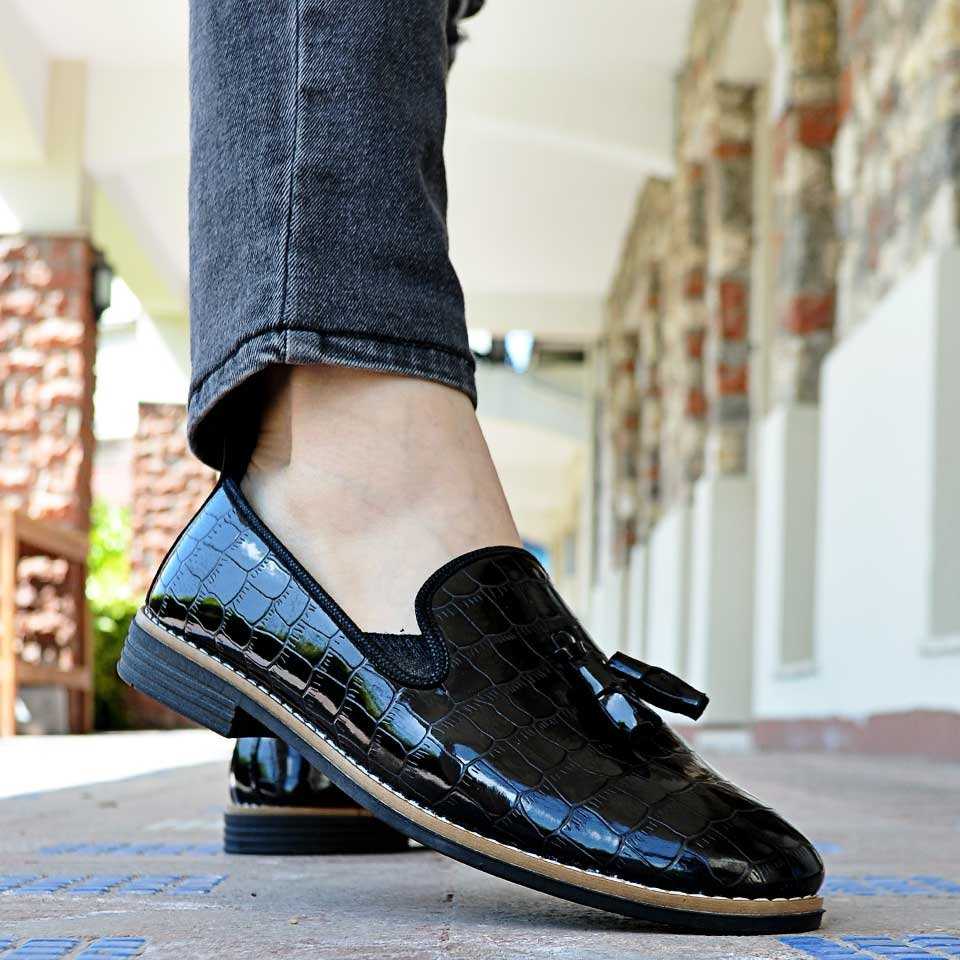 Taşkın Timsah Baskı Püsküllü Erkek Ayakkabı Parlak Siyah