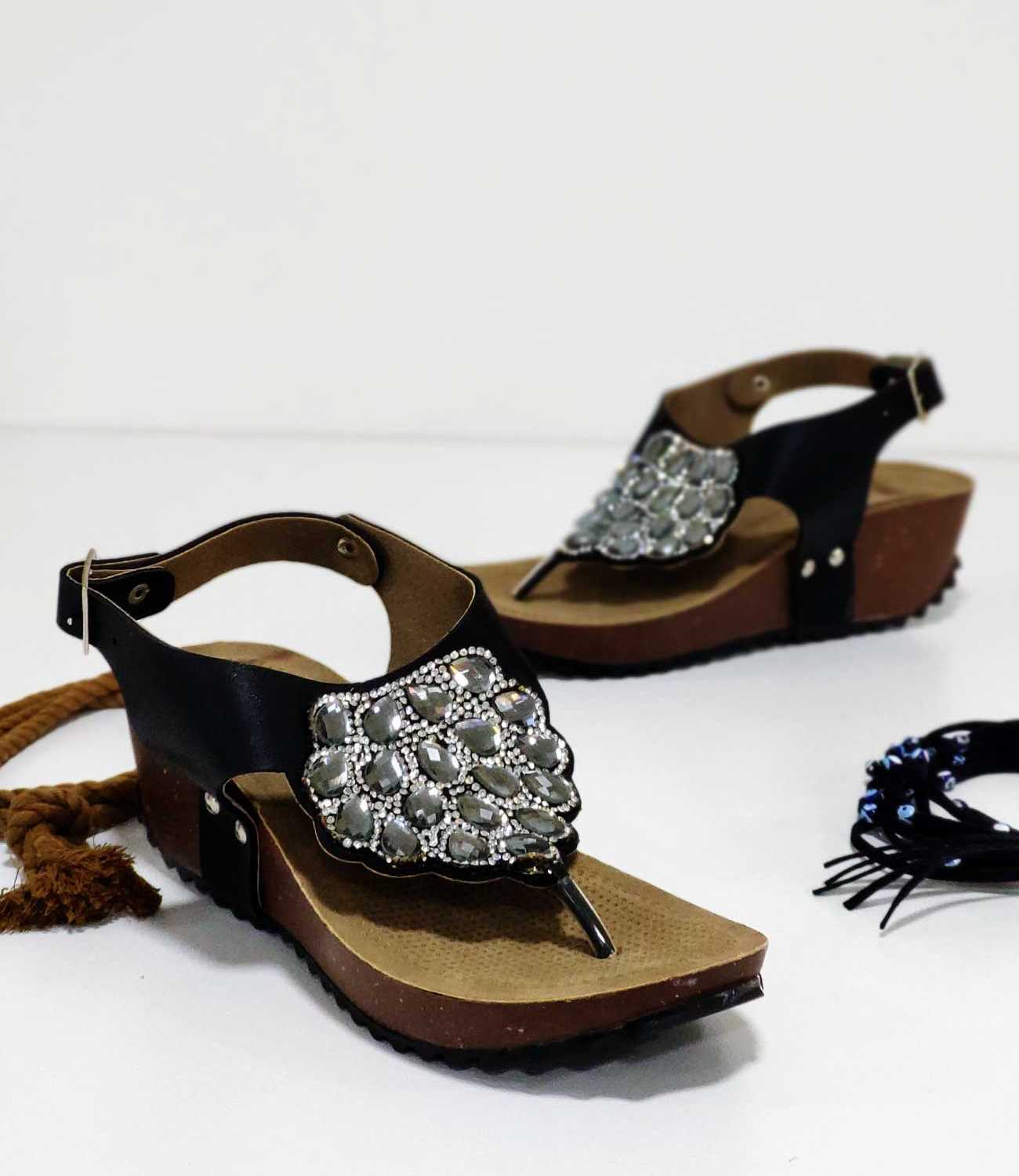 Dolgulu Parmak Arası Taşlı Sandalet Siyah
