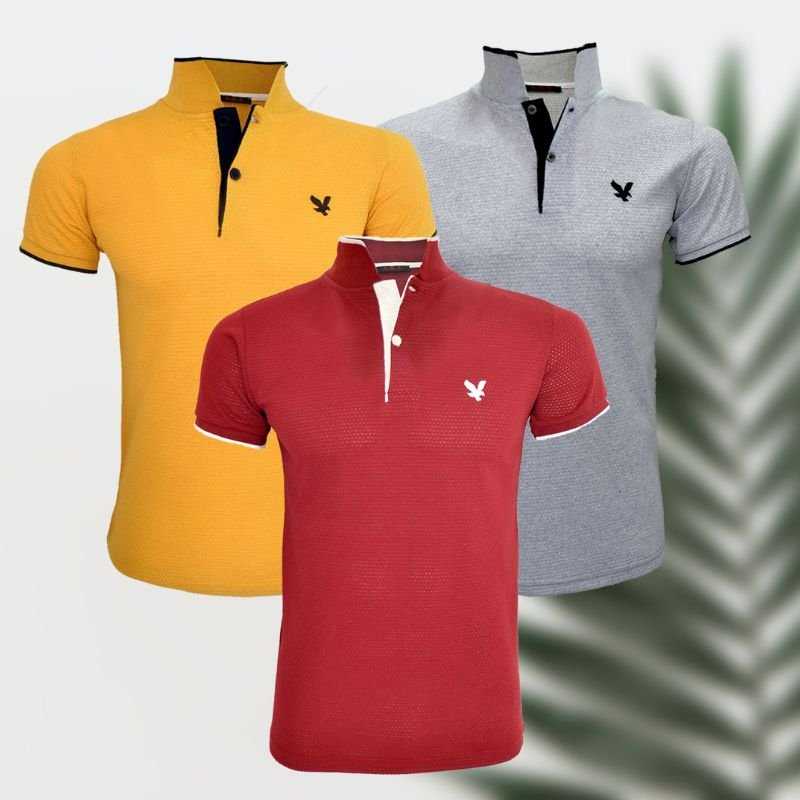 3 Adet Petek Desenli Polo Yaka Erkek Tişört (Sarı - Bordo - Gri)