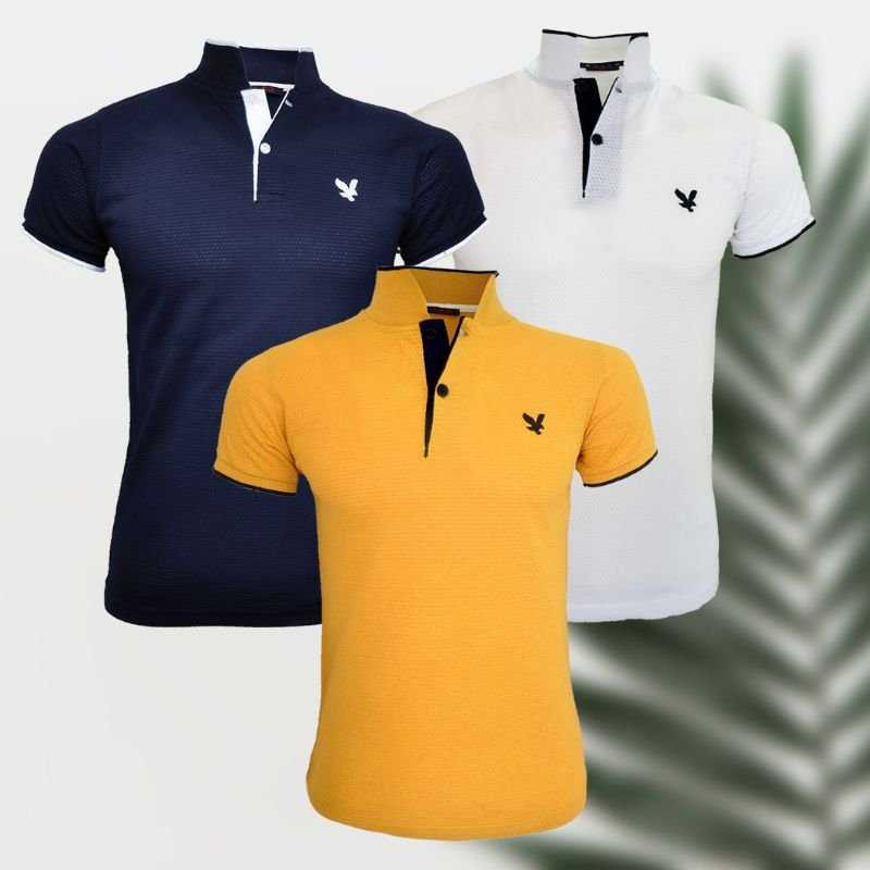 3 Adet Petek Desenli Polo Yaka Erkek Tişört (Lacivert - Sarı - Beyaz)